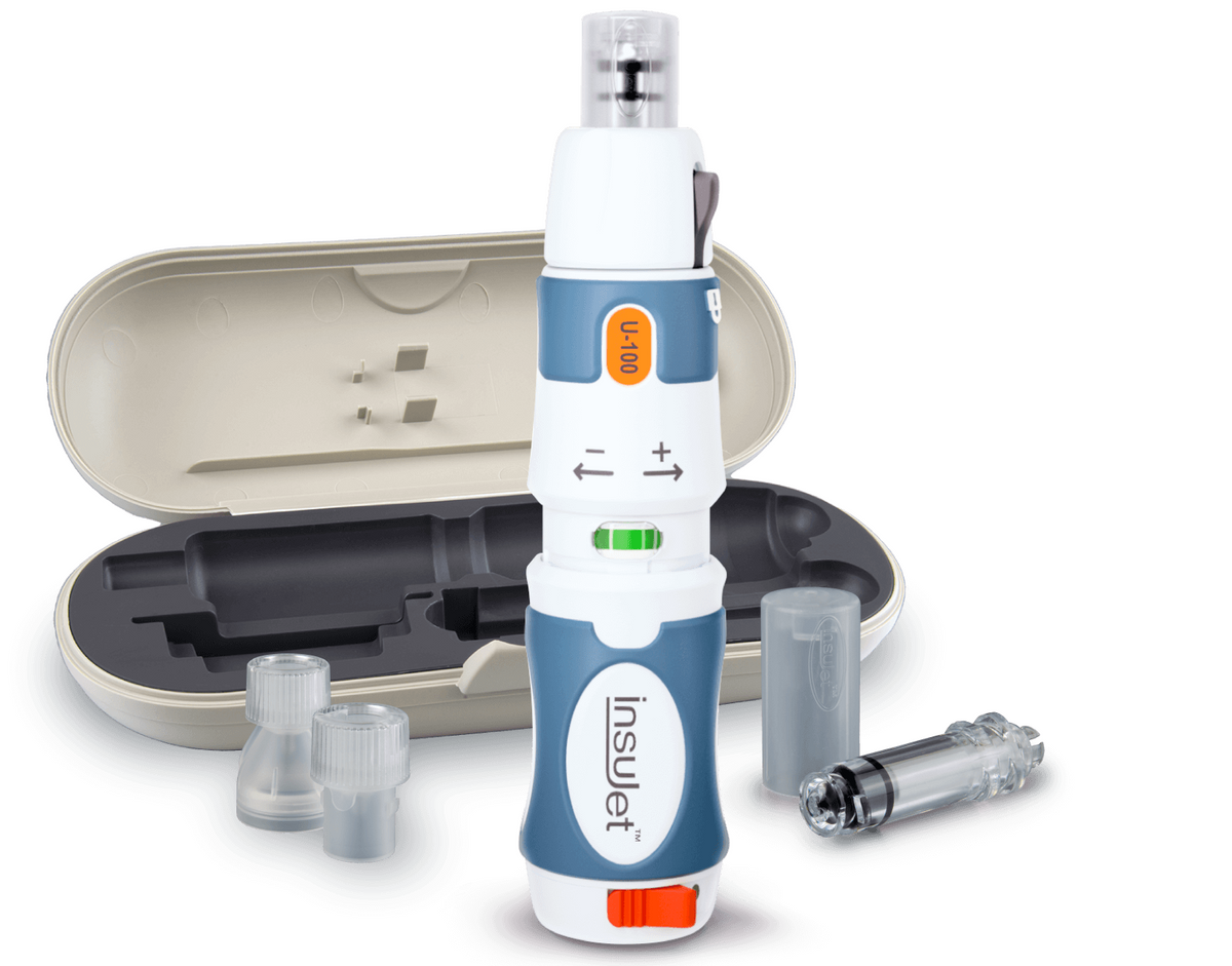 The InsuJet needle-free injection device makes for a great alternative to insulin needles. It allows for consistent insulin absorption, improved treatment efficacy, and reduced risk for accidental intramuscular injections.